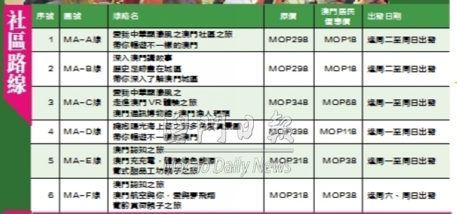 為積極落實(shí)施政報(bào)告中“推動(dòng)綜合休閒旅遊業(yè)復(fù)甦”,逐步恢復(fù)澳門旅遊業(yè)的活力,由旅遊局統(tǒng)籌、澳門基金會(huì)贊助的“心出發(fā) • 遊澳門”本地遊項(xiàng)目,今起正式推出。居民可聯(lián)繫加入計(jì)劃的旅行社門店,報(bào)名參加從本月廿二日至九月三十日期間出發(fā)的本地遊路線,每人每次參團(tuán)可獲津貼二百八十元,津貼上限為五百六十元。
