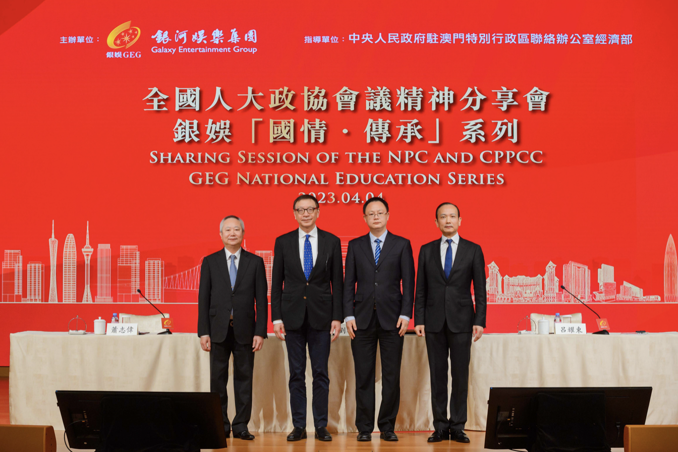 【澳門日報消息】銀河娛樂集團今日主辦全國人大政協(xié)會議精神分享會——銀娛“國情?傳承”系列假銀河國際會議中心之銀河演講廳舉行。是次活動邀請到中聯(lián)辦經(jīng)濟部副處長楊毅出席指導(dǎo),並邀請到全國人大代表蕭志偉、全國政協(xié)常委劉雅煌,全國政協(xié)委員、銀娛副主席呂耀東就今屆“兩會”,以線上線下形式向合共約八百名銀娛管理層成員分享真知灼見以及個人體會。